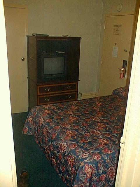 The queen bed filled the room, as you can see. The picture on the left is from the doorway of the room, and you can see the bathroom door on the other side of the bed. The picture on the right is from inside the bathroom door.
