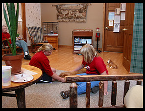 And a picture of Sara and Jesse playing with one of the pets that the Hallett Cottages has. (A good idea IMO, the residents love them.)